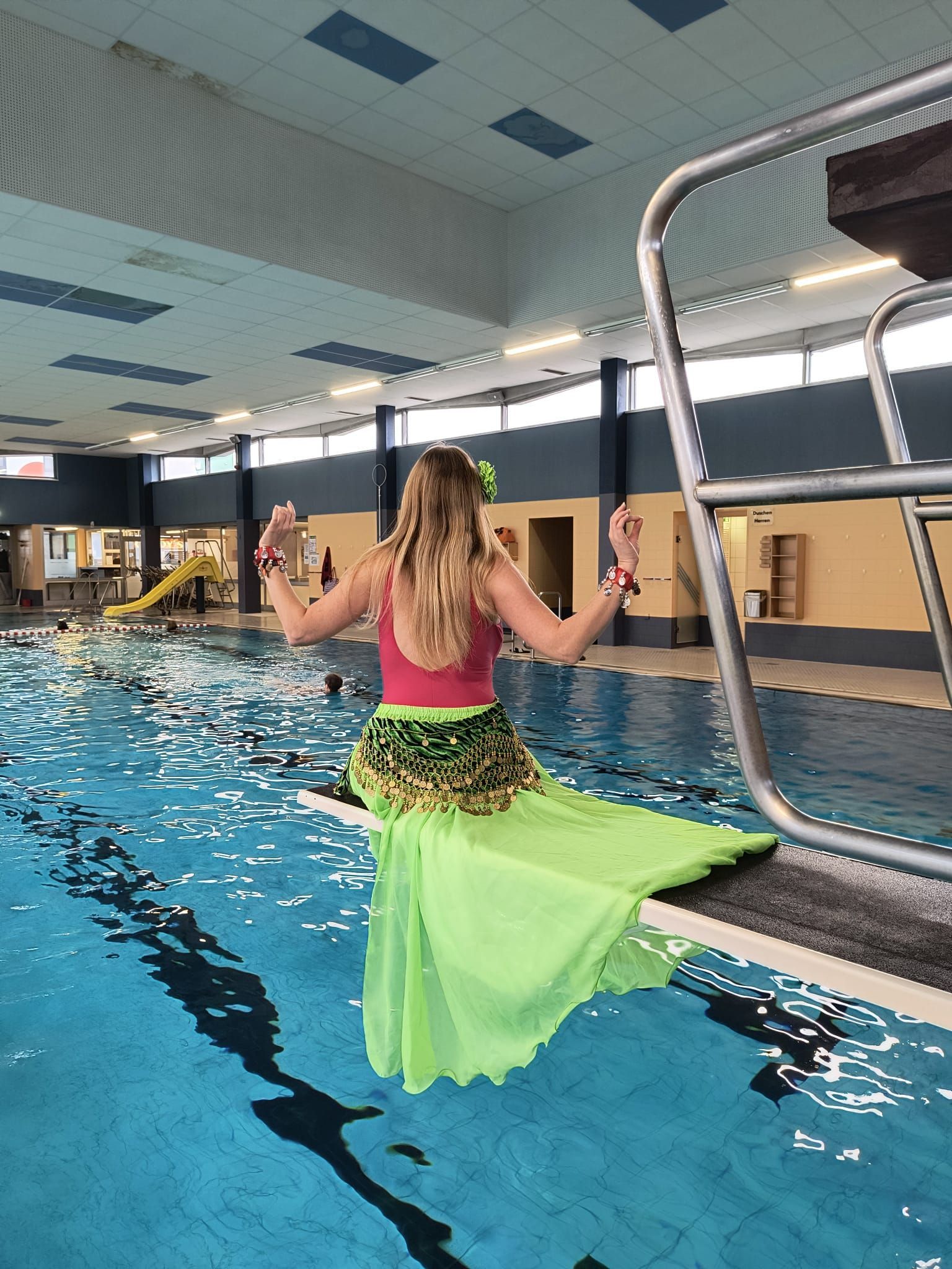 Ihr Frauen, das müßt Ihr ausprobieren, so was von belebend und entspannend. Einige Elemente beim Tanzen im Wasser sind die Gleichen wie "an Land", das Aufwärmen, das Dehnen und Strecken, die Tanzelemente, das Freie Tanzen. Und einige sind anders. Die Bewegungen haben mehr "Auftrieb", sind nicht so erdig, eher fließend, weich rund, ohne Ecken, der ganze Körper kann mitschwingen, in Achten und Wellen, himmlisch. Und dann erst die Shimmies, wenn das Wasser um Dich herum sanfte Kräusel wirft.